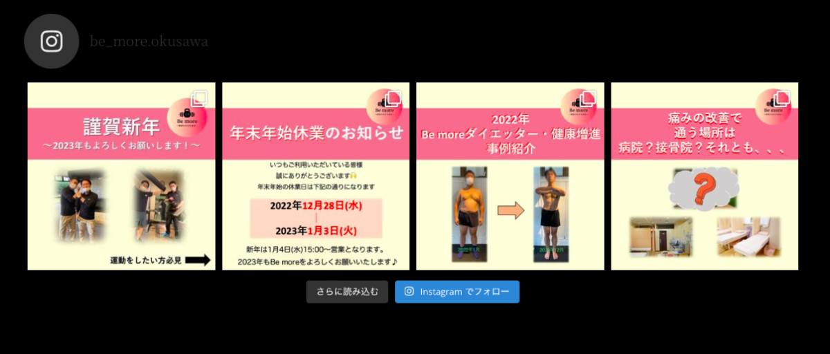 HPのトップページの中にはインスタグラムの投稿がチラ見できるようなコーナーもあるので、